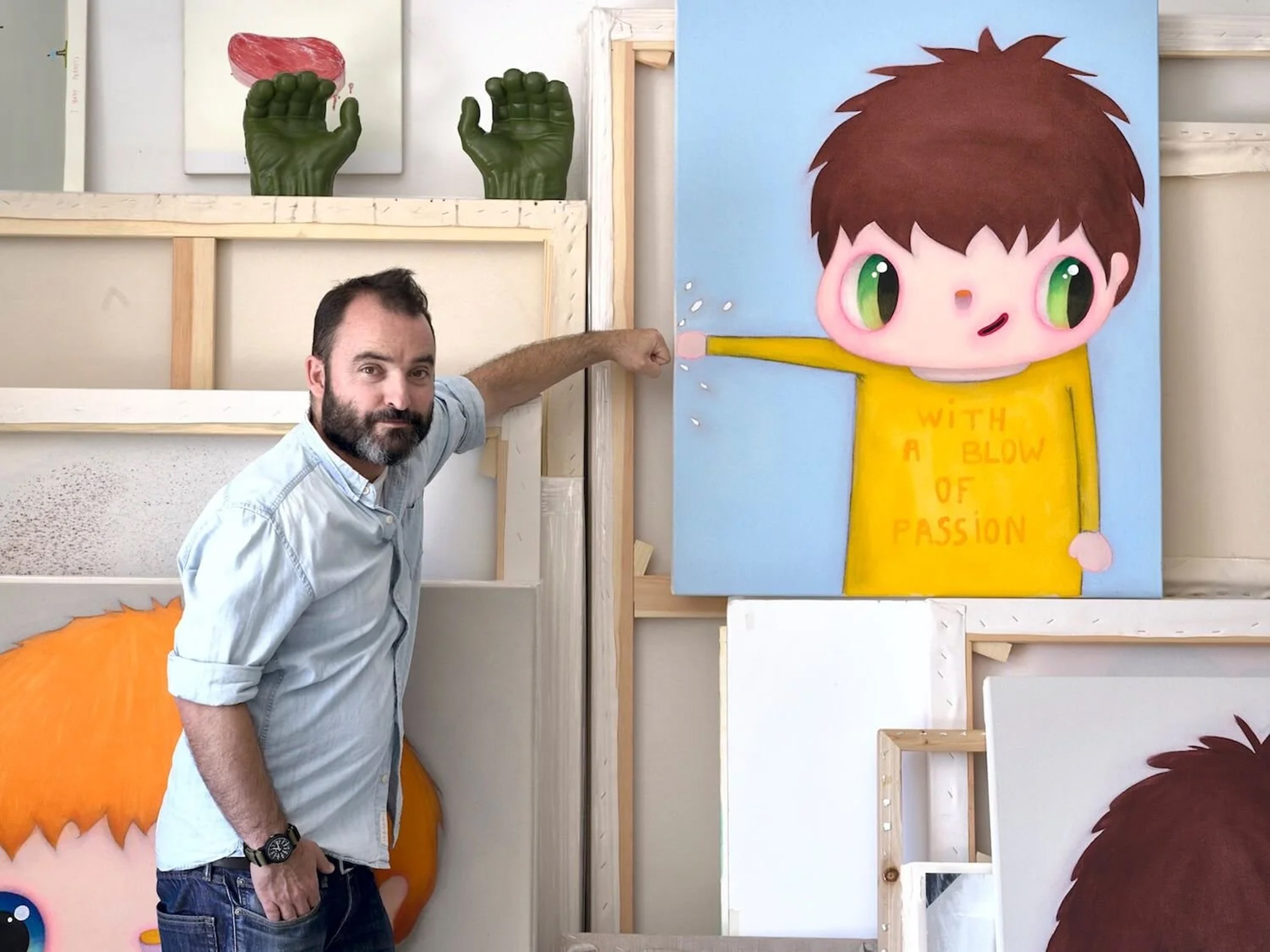 Calleja’s work centers on wide-eyed, bowl-cut characters that act as modern mirrors for the viewer. While his aesthetic draws inspiration from Pop Art and Japanese Kawaii culture—often leading to comparisons with Yoshitomo Nara—his work carries a distinct European wit. His characters aren't just "cute"; they are often messengers of irony, frequently sporting sarcastic T-shirt slogans or placed in surreal settings that challenge the boundary between childhood wonder and adult cynicism.